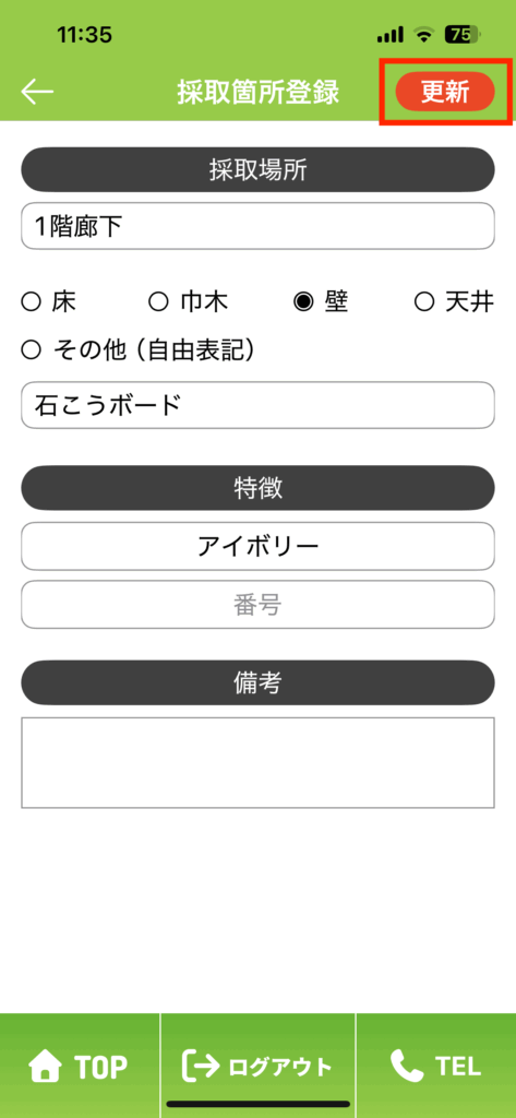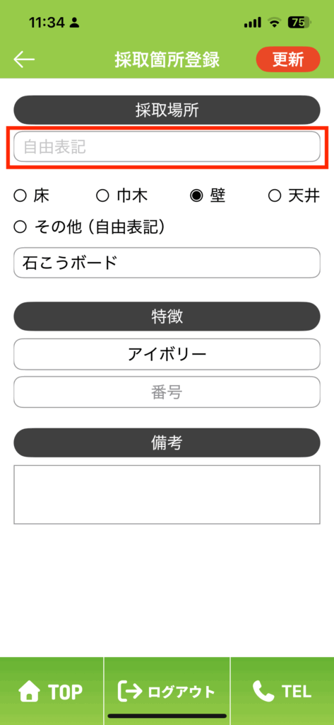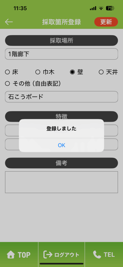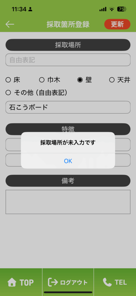 下の画像のように、「更新」ボタンをタップした際に「採取場所が未入力です」というアラートが表示された場合の対処法をご紹介します。