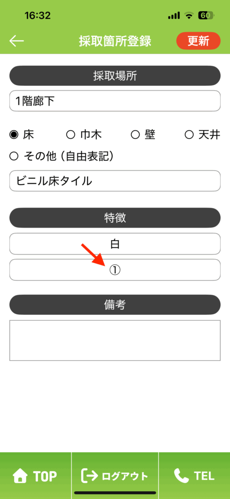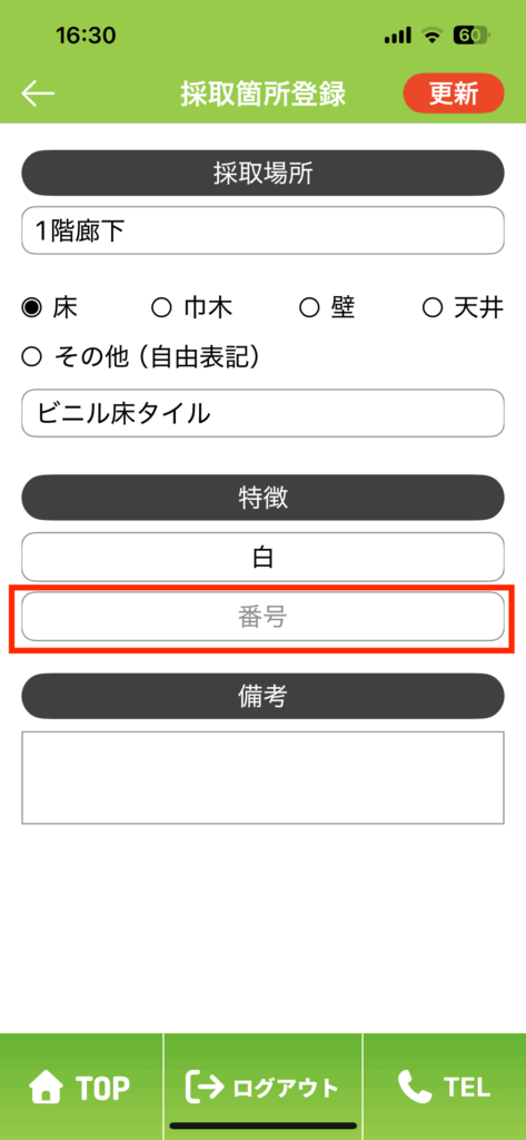 下の画像のように、「採取箇所登録」の「特徴」入力欄の2行目には「番号」と記載されています。この欄は、色の名前は同じでも、厳密には異なる色の建材を区別したい場合に使用します。以下の手順でご活用ください。
